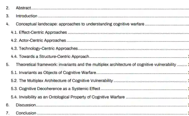 本研究阐述了一种认知战争的结构中心概念框架,将分析焦点从效果、行为体和技术转移到认知脆弱性的结构性基础。此分析的核心是社会技术系统的不变量及其相互连接的架构,特别是支撑认知连贯性、战略身份和适应性转变能力的配置。