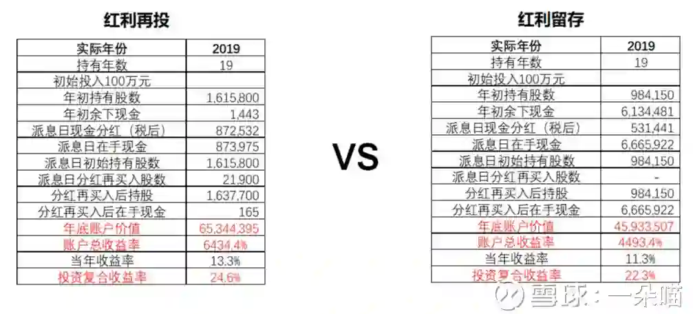 到2019年1月25日收盘,我们“红利留存”策略的账户价值从100万增长到了4593.3507万元,较“红利再投资”策略的账户价值低了近2000万元!复合投资收益率为22.3%,较“红利再投资”策略低2.3%(别小看这2个点的差距,19年下来,收益率会差2000%!)。