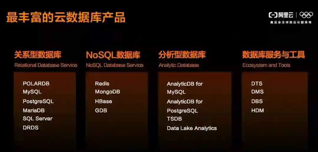经过十年的应用实践以及技术迭代,阿里云已拥有国内最强大和丰富的云数据库产品家族,涵盖关系型数据库、非关系型数据库、分析型数据库以及迁移工具等,满足用户不同的数据库应用开发需求,并且解决企业核心业务上云的关键难题。