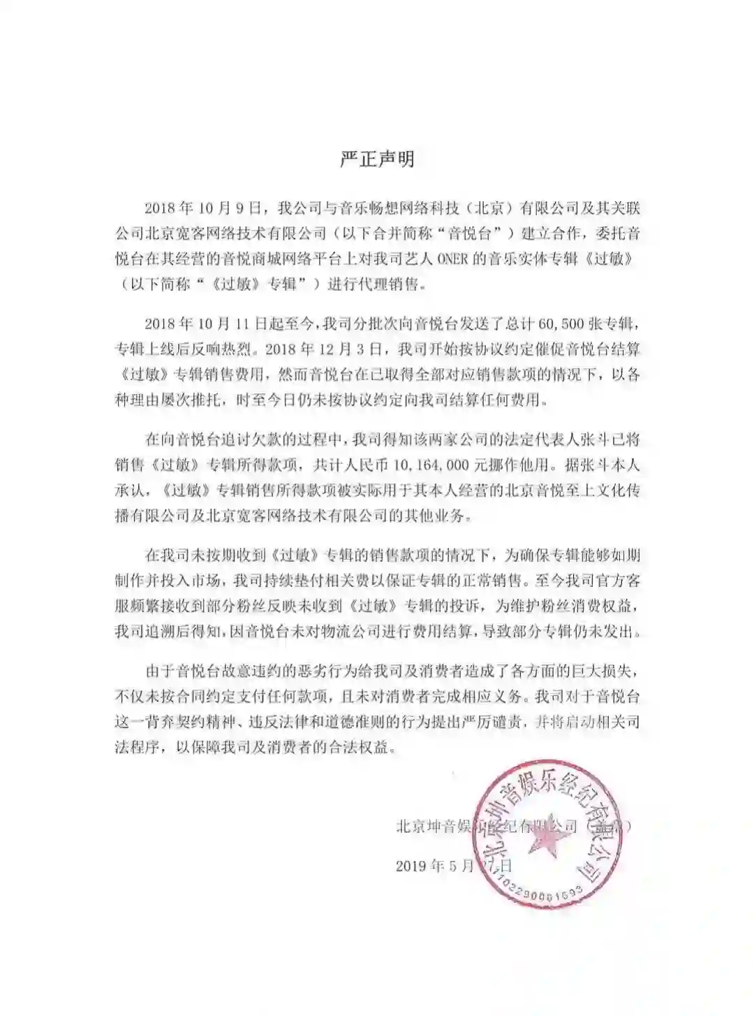 “5月27日,坤音娱乐的一纸欠款声明将音悦台送上话题热搜。其拖欠国内当红男子偶像组合“坤音四子”(英文名:ONER)的专辑销售款项,达1000多万。目前,“坤音四子”粉丝正在微博声讨音悦台CEO张斗还钱。