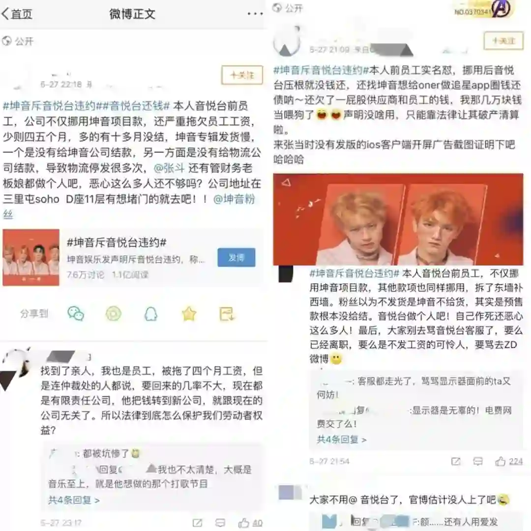 5月27日晚,随着“坤音斥音悦台违约事件”的发酵,多位音悦台前员工发微博表示,音悦台不仅挪用坤音专辑销售款,还严重欠薪员工,少则四五个月,多则十多个月工资未结。