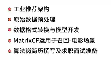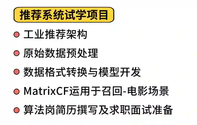 在此也给大家准备了福利,我邀请到本次推荐系统正式课的老师,录制了推荐系统的试学项目,一共有5节,对大家了解算法实践以及准备求职面试有很大的帮助。