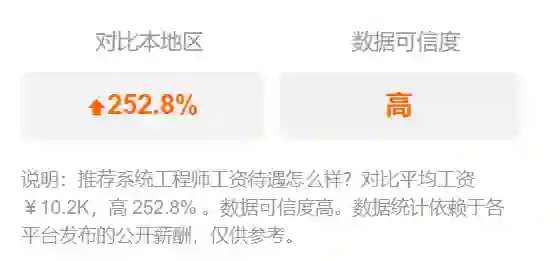 截至2022年8月4日,推荐系统工程师月平均工资¥30K-50K,对比平均工资¥10.2K高252.8%,即使每个地区薪资情况各有不同,但推荐岗的薪资也至少高于当地平均工资50%。
