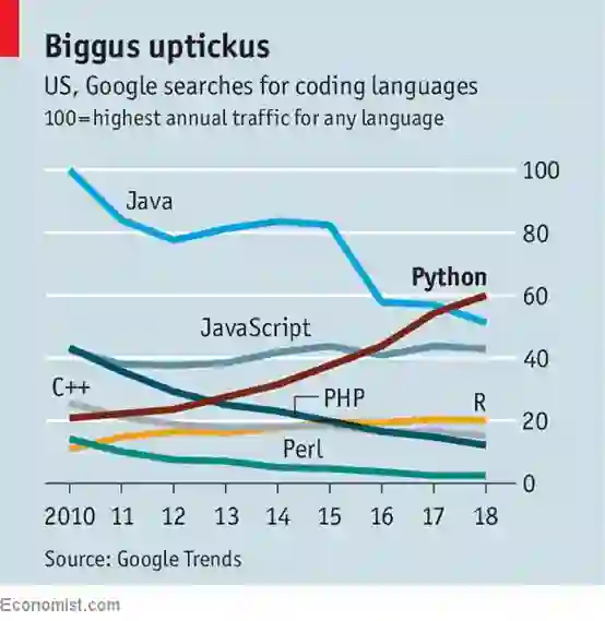 经济学人的一张数据图来看,自2010年以来,Python的查询率增加了三倍,而其他编程语言的查询率则持平或呈下降趋势(见图表)。