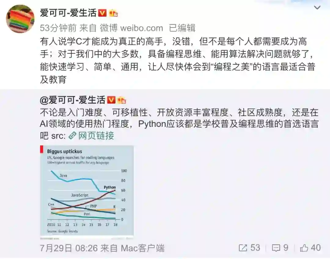 学界大咖微博博主爱可可老师也对Python这一编程语言做出了如此评价。