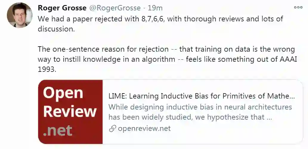 AI研究员RogerGrosse也表示他们有一篇得分8,7,7,6的论文在经过了全面的评审和大量的讨论仍被拒绝了,拒绝的理由用一句话来说就是:“在数据上的训练是向算法灌输知识的错误方式——
