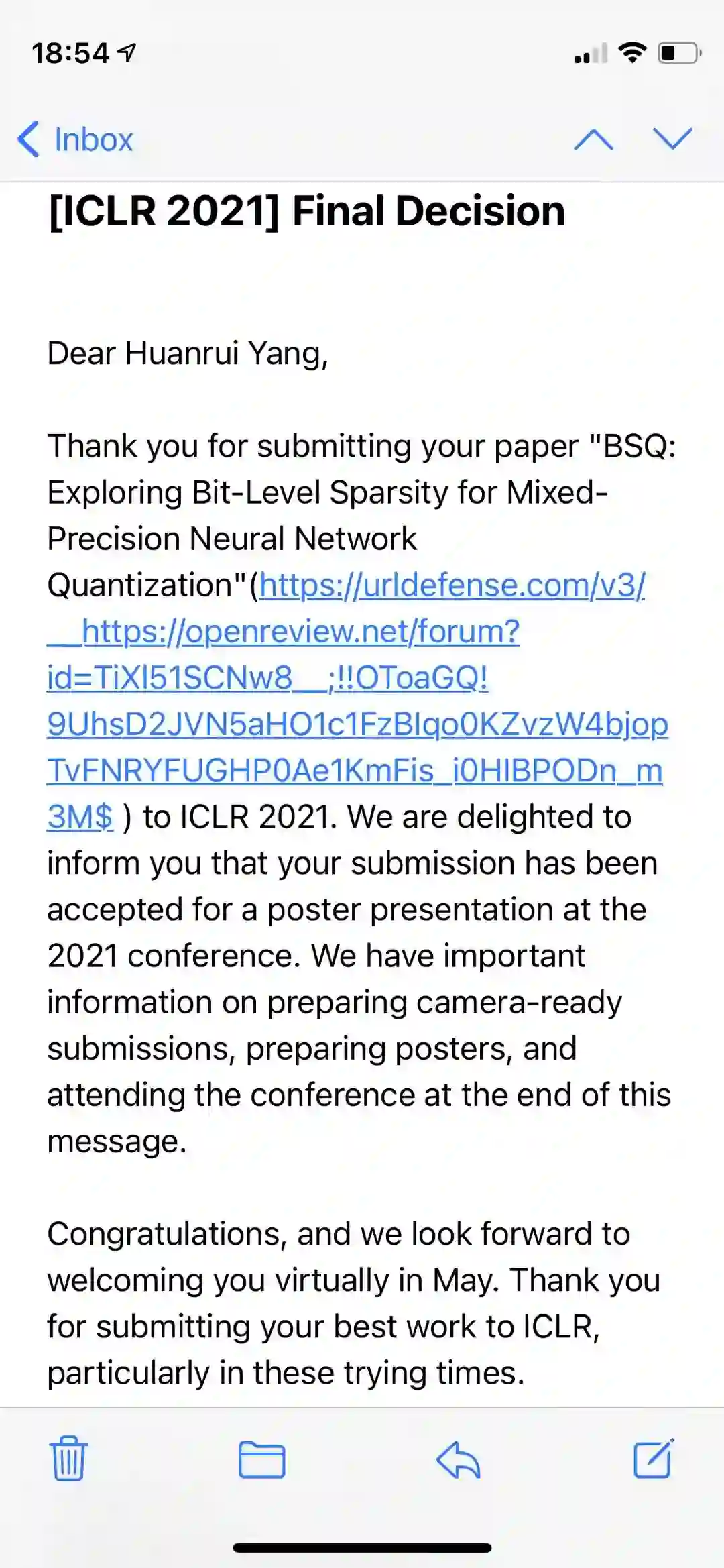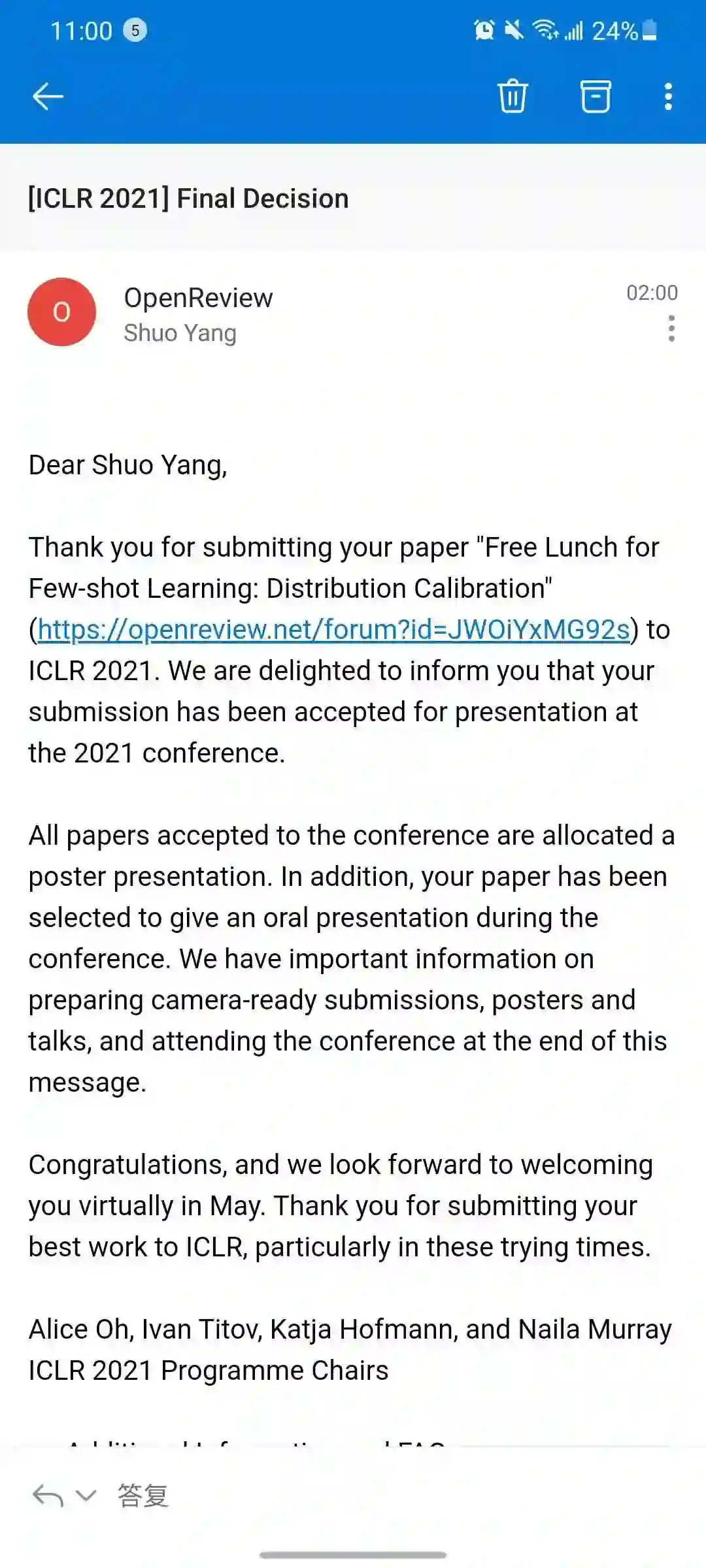 以下是论文被接收的通知邮件,大家快来下滑翻一翻沾沾喜气!