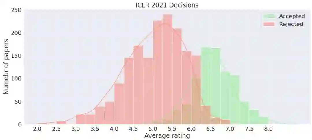 8、平均得分为6分的论文有39%的机会被接收,而平均得分为6.5的论文被接收的概率大大增加,达到了91% !