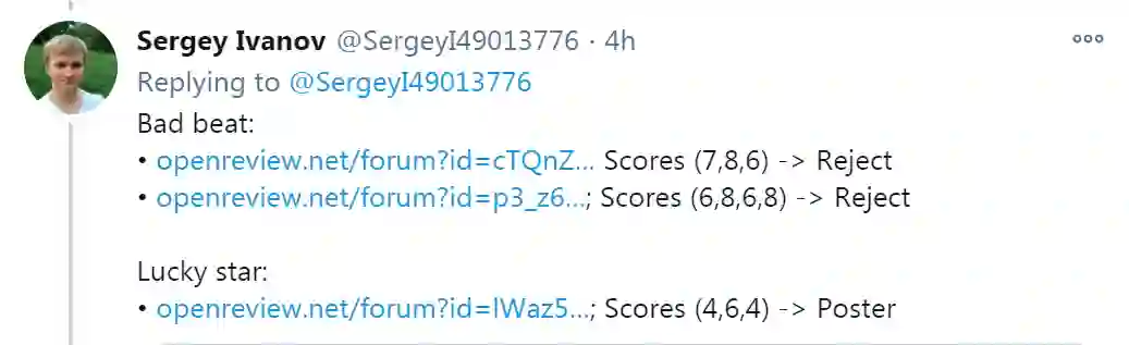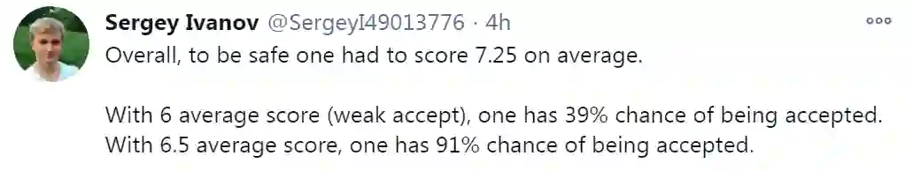 之后Sergey Ivanov简单的指出了有得分为7,8,6和6,8,6,8的论文被拒绝,而得分为4,6,4的论文被幸运接收。