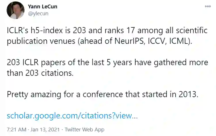 “ICLR的h5指数为203,在所有科学出版物中排名第17,超过了NeurIPS、ICCV和ICML(在AI顶会中仅落后于CVPR,该榜单的前三名是 Nature、新英格兰医学杂志和 Science。)。在过去五年中有203篇论文获得了超过203个引用,这对于一个从2013年才开始的会议来说,取得的成绩可谓是令人惊叹”。