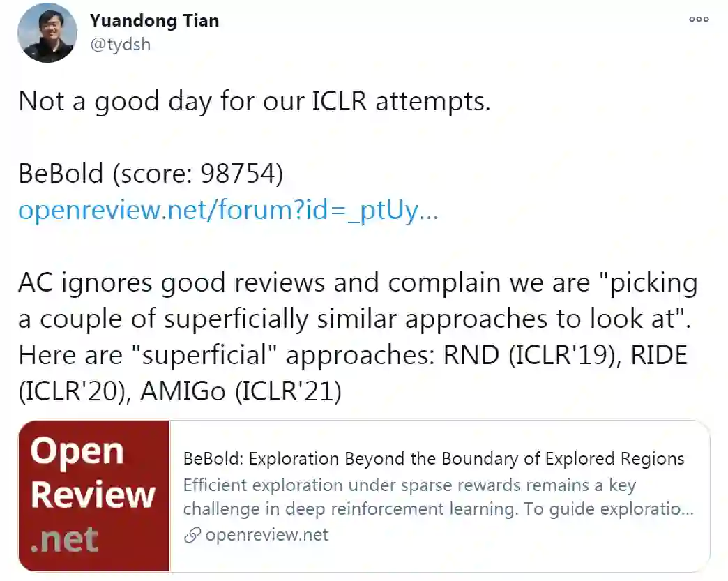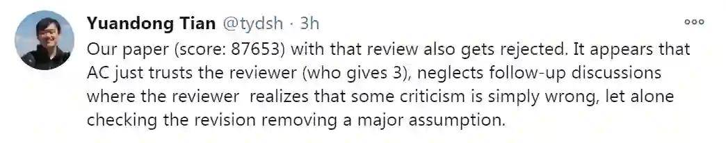 田渊栋随后又说道,他们的另一篇得分为8,7,6,5,3的论文也被拒绝了,似乎AC只信任给了3分的评审,而忽略了后续的一些讨论(一些评审后来意识到有些针对论文的批评是完全错误的,更不用说后来检查修订删除了一个主要的假设)。
