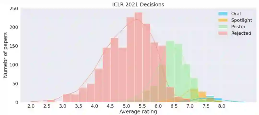 Sergey Ivanov也制作了论文可视化统计图,如下所示,可以看出全部论文的平均得分大概是符合正态分布的。