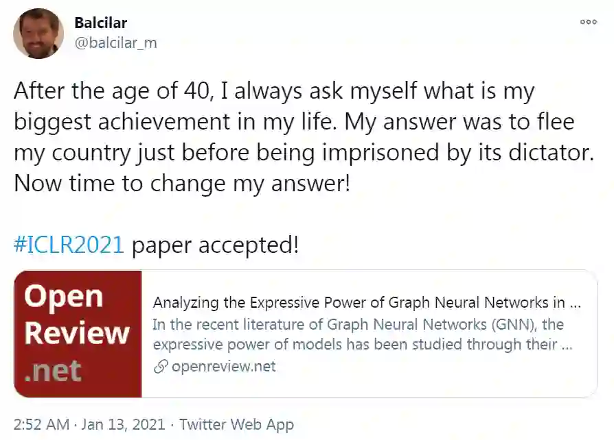 机器学习研究员Balcilar在得知自己的论文被ICLR 2021录取之后甚至表示:“在我四十岁之后,我总是问自己我这一生中最大的成就是什么,我之前的答案是是在被独裁者监禁之前逃离我的国家。现在是时候改变我的答案了!