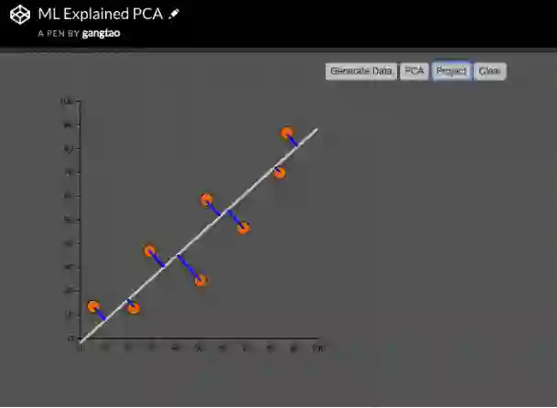 这里我们先用鼠标随机生成8个数据点,然后绘制出表示主成分的白色直线。这根线就是二维数据降维后的主成分,蓝色的直线是数据点在新的主成分维度上的投影线,也就是垂线。主成分分析的数学意义可以看成是找到这根白色直线,使得投影的蓝色线段的长度的和为最小值。