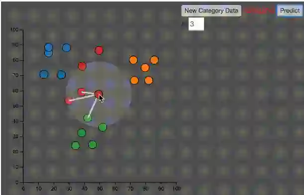 如上图所示,K=3,鼠标移动到任何一个点,就找到距离该点最近的K个点,然后,这K个点投票,多数表决获胜。就是这么简单。