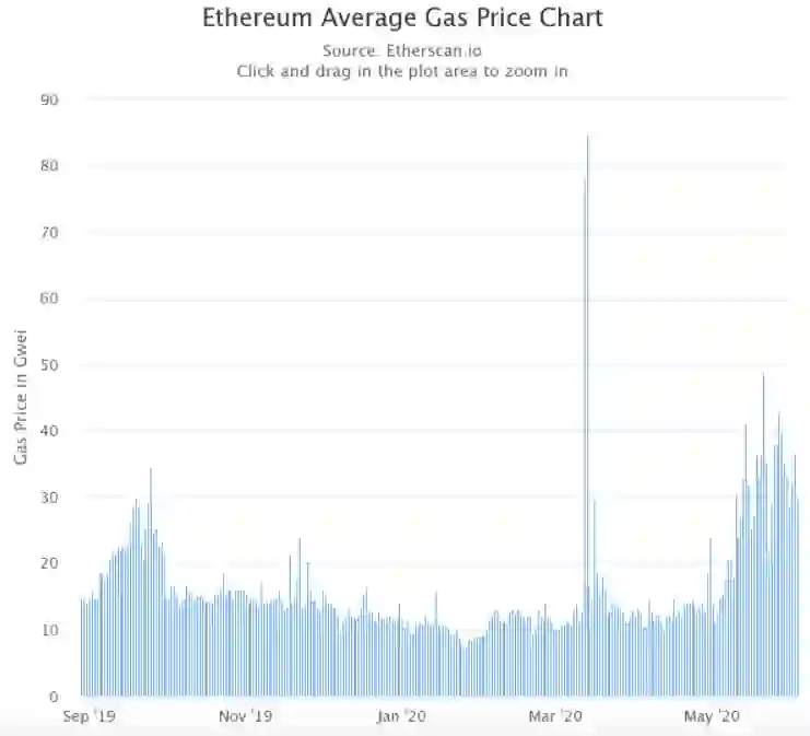 数据显示,以太坊网络上的平均燃料价格自 5 月初以来上涨了三倍多,在过去几天平均上涨了 30 Gwei。EthGasStation 表示,这样导致的结果是发送一笔简单的 ETH 交易平均要收取 0.16 美元的费用,这还是尽可能少用燃料方式下的价格,ERC-20 令牌传输和智能合约呼叫的成本可能是这个数字的好几倍。