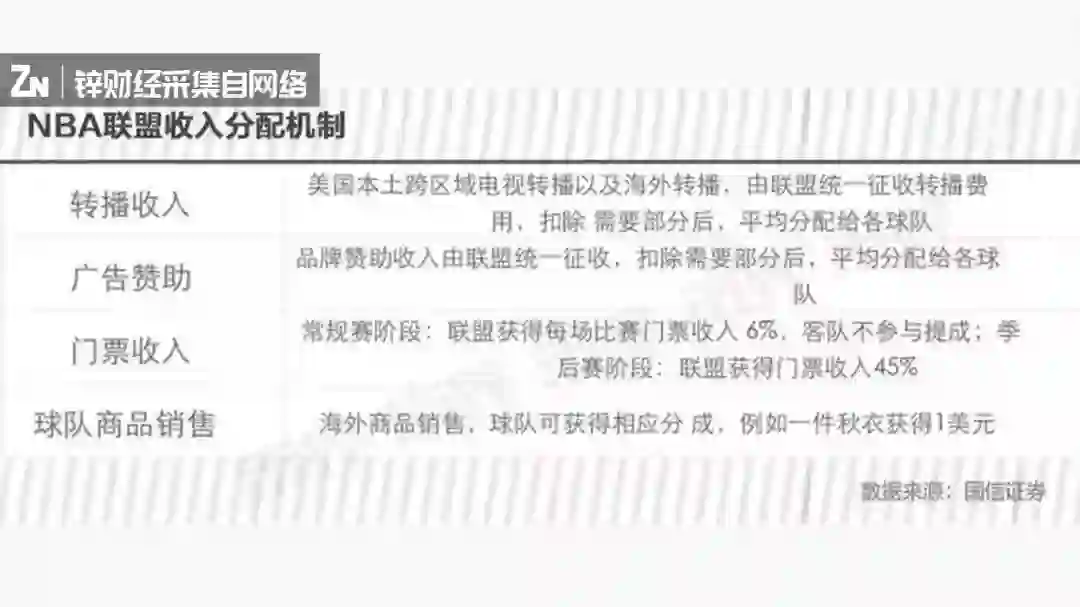 目前,NBA在中国的主要收入来源包括,赛事转播权、广告赞助、特许商品售卖、篮球比赛门票收入。NBA副主席兼首席运营官谭惠民在去年接受福布斯新闻采访时指出,NBA中国市场的价值已经达到40亿美元。据相关人士分析,这可以占到NBA总收入的10%。
