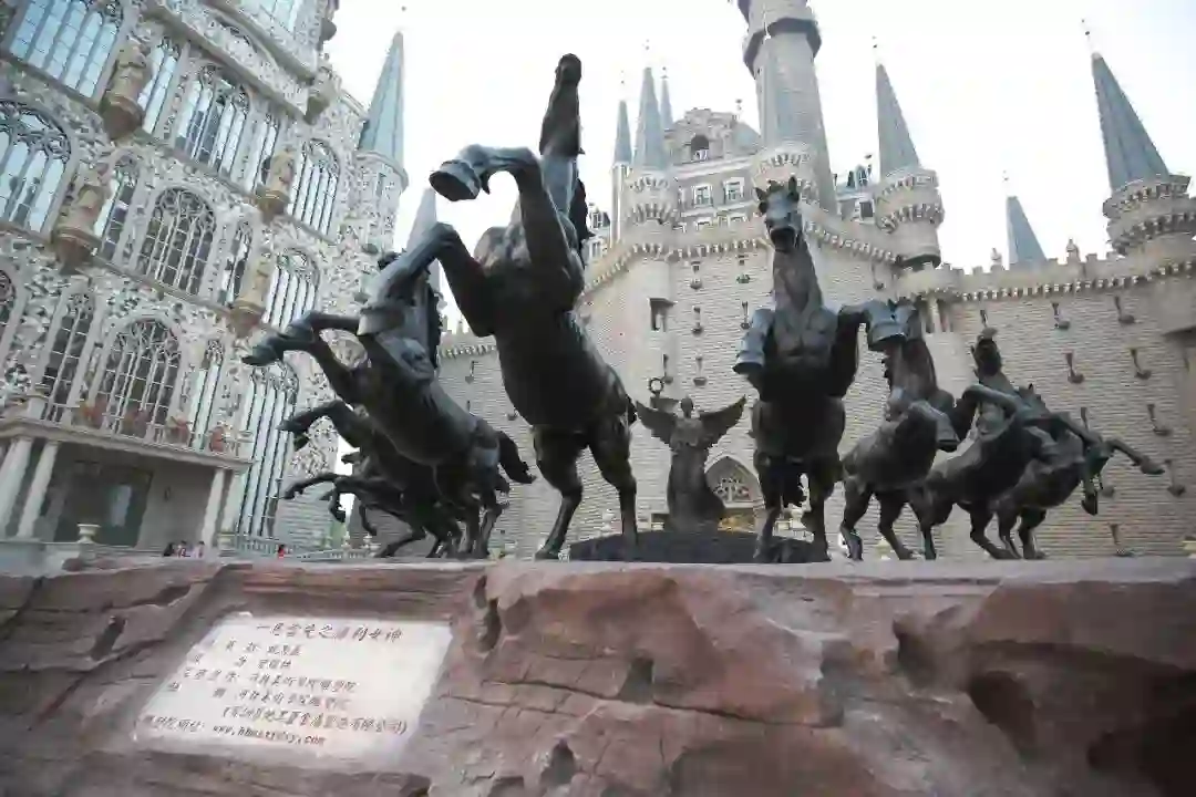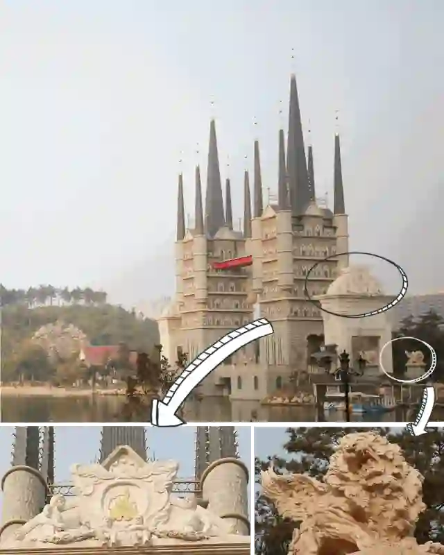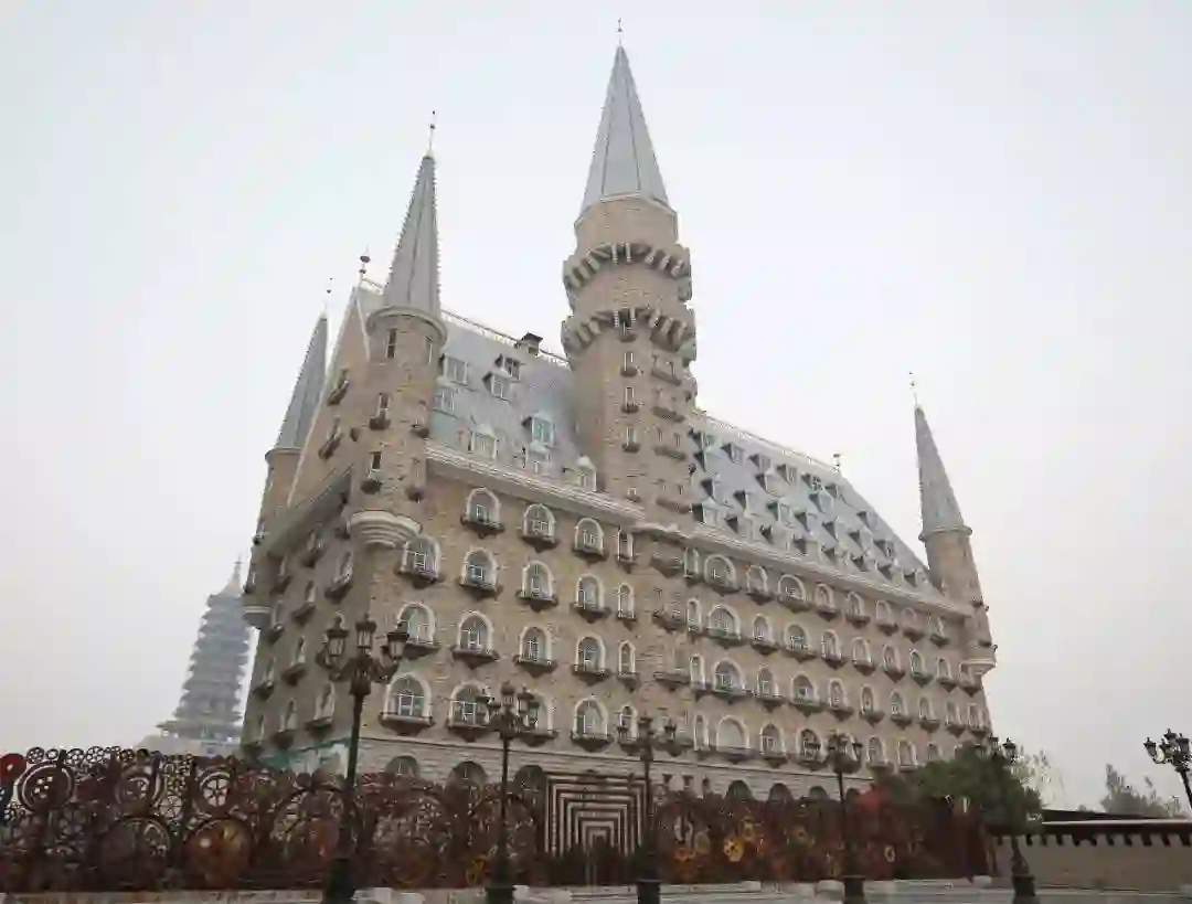 帝国广场上的城堡群名叫“灰姑娘城堡”,从左至右分别是城堡酒店、河北美院的行政办公楼和学生宿舍。学校并不对外开放,如果你愿意花不到300元入住城堡酒店,就可以凭房卡进校园去参观。