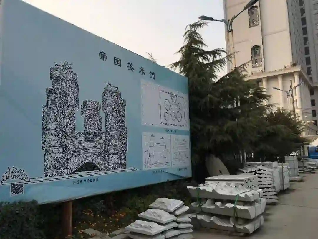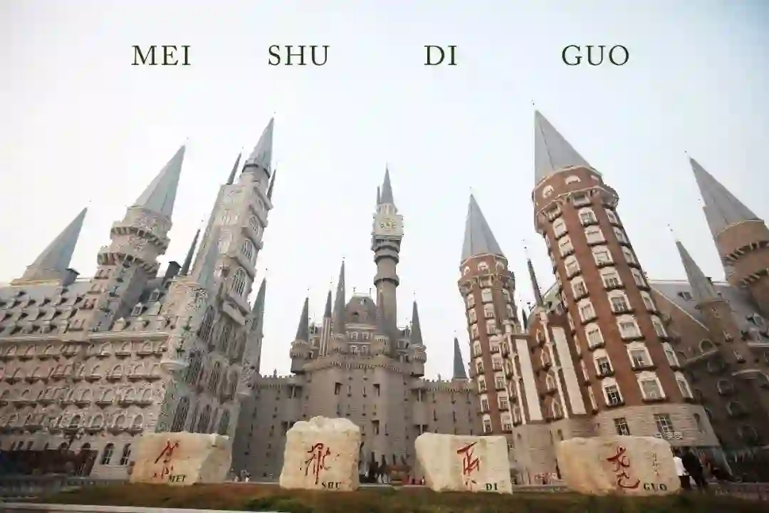 学校正门口的广场上摆着四个石墩,上面写着四个大字,眩晕中的我们经过仔细辨认,还是没认出那是什么字,好在每个字的右下角都贴心地标注了拼音——“MEI”、“SHU”、“DI”、“GUO”,连起来读就是——“美术帝国”,而我们此时此看身处的校门前巨大的广场,也有名字,叫——“帝国广场”。
