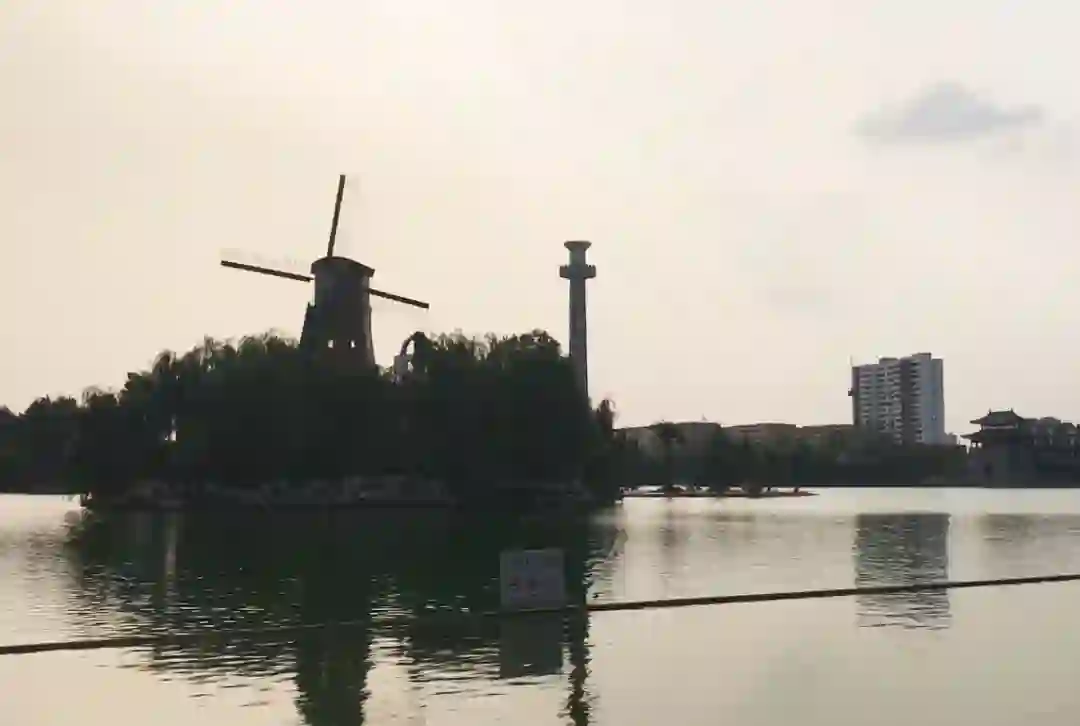 “海”中央还两个小岛,一个上面有荷兰风车,另一个则有超大泳池和三条中华田园犬。