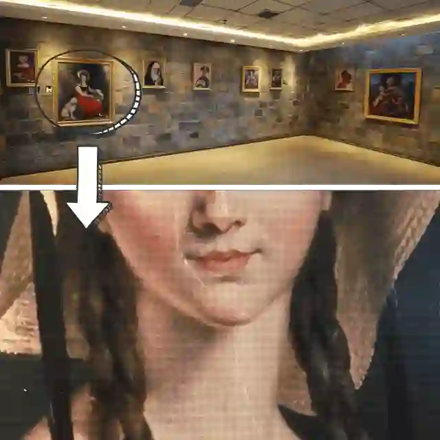 顺着教室走廊往里走,手机信号会渐渐减弱,过道墙上每间隔一米就展示着一副世界名画,我们原以为那是学生临摹的作品,但走近一看,这些世界名画都是用塑料布打印下来的,灯光一打便有强烈的反光效果,近看甚至能看到塑料布粗糙的像素颗粒。