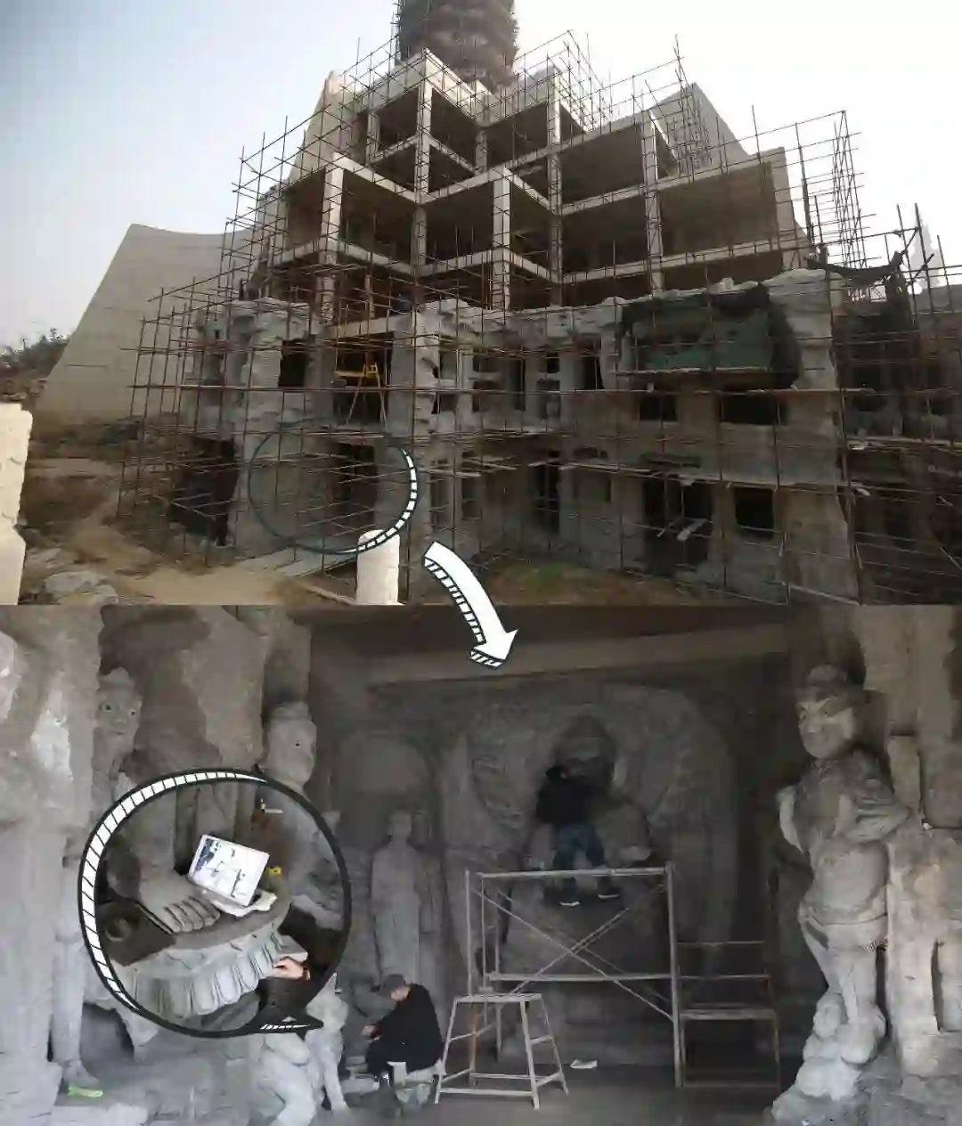至于那三面没有被建造成石窟的水泥墙面,周围施工的工人告诉我们,未来,那里会建造三座高30米的大佛,建成之后,大概就是这个样子——