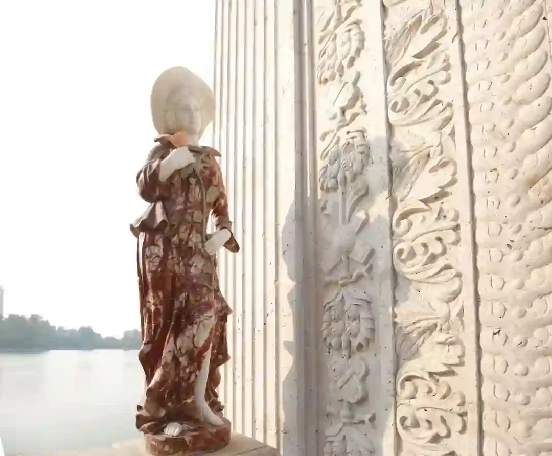 桥身的栏杆上每间隔一米左右就有一个希腊美女雕像,她们的姿态、服装、配饰各不相同,走近一看,裙子和饰品的颜色并不是画上去的,而是用不同色彩、纹理的大理石料直接雕刻制成的。