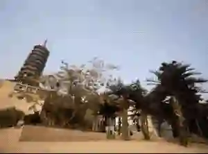 目前塔身已经成型,但塔基还只是赤裸的水泥墙面。一些工人正在墙面上作业——给它做石窟样式的外包装。洞窟内部也有工作人员正在雕琢佛像,他们是河北美术学院雕塑系的毕业生,被聘用回来继续建设学校。