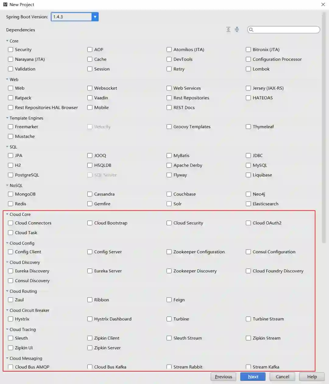 点击Next,进入选择Spring Boot版本和依赖管理的窗口。在这里值的我们关注的是,它不仅包含了Spring Boot Starter POMs中的各个依赖,还包含了Spring Cloud的各种依赖。