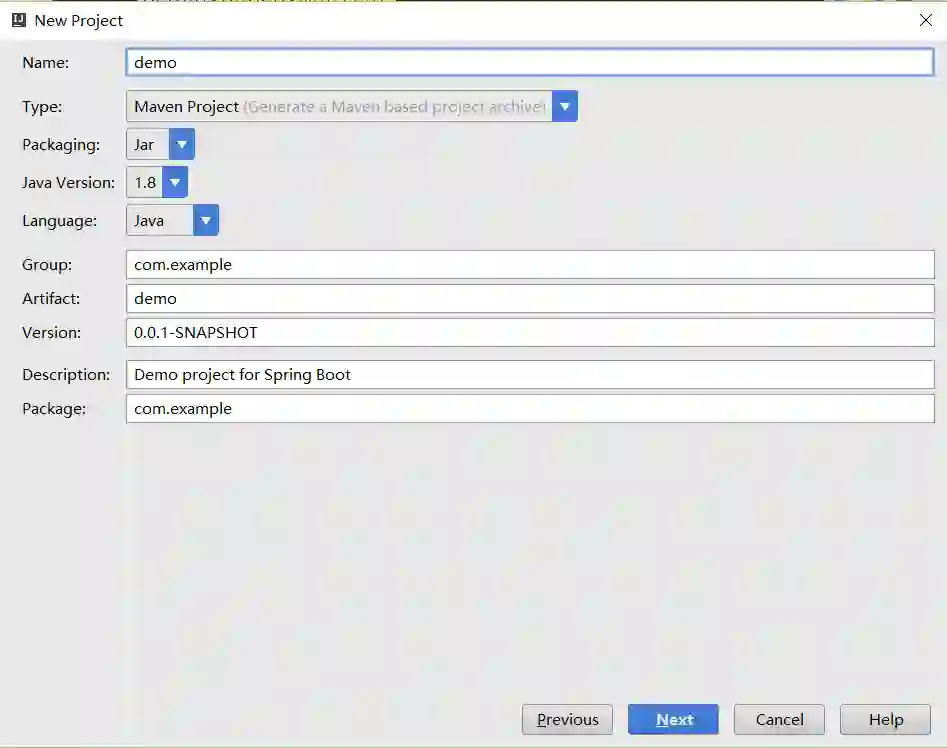 点击Next,等待片刻后,我们可以看到如下图所示的工程信息窗口,在这里我们可以编辑我们想要创建的工程信息。其中,Type可以改变我们要构建的工程类型,比如:Maven、Gradle;Language可以选择:Java、Groovy、Kotlin。