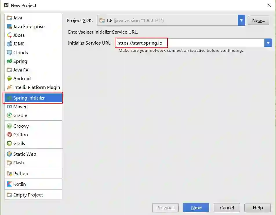 菜单栏中选择File=>New=>Project..,我们可以看到如下图所示的创建功能窗口。其中Initial Service Url指向的地址就是Spring官方提供的Spring Initializr工具地址,所以这里创建的工程实际上也是基于它的Web工具来实现的。