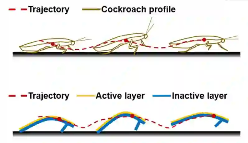 当交流电压(低至 8 伏,但通常约 60 伏)通过电极时,其中的 PVDF 热塑性层会发生周期性的伸展和收缩,导致机器人背部弯曲,而底下的小脚会发生移动,如下图所示: