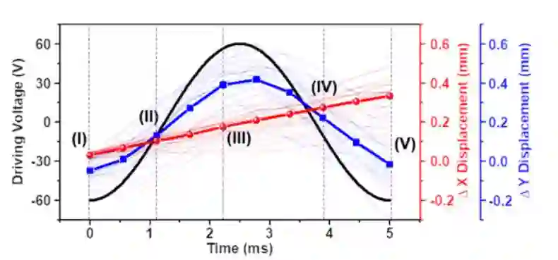 例如,下图展示了在- 60 ~ 60v(黑线)驱动电压下原型机器人的横向位移(红线)和纵向位移(蓝线)实验结果。