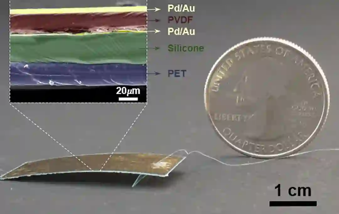 其中第一层和第三层都是 50nm 厚的钯金电极(Pd/Au),中间夹着一层 18μm 厚的 PVDF 热塑性层,最下面两层则是 25μm 厚的硅粘合剂和 25μm 厚的 PET 材料。