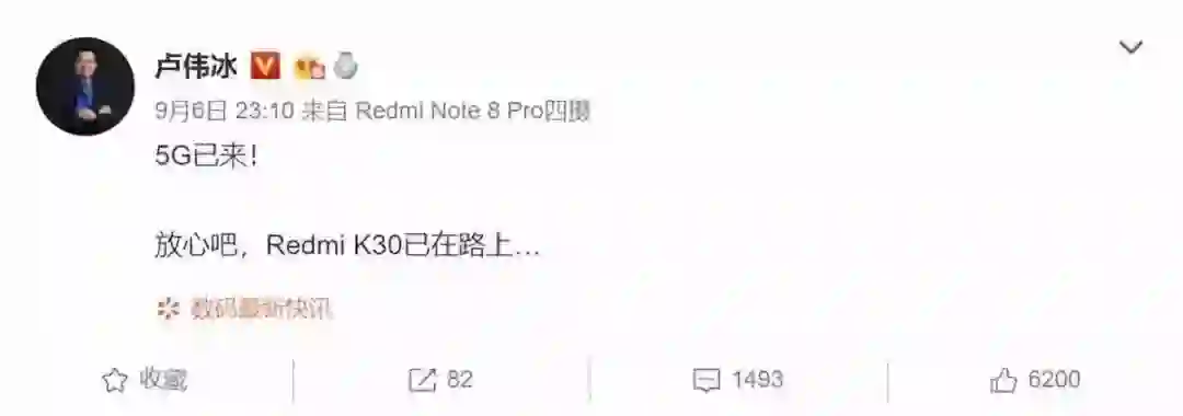 看完小米我们再来看看红米,小米集团副总裁、Redmi品牌总经理卢伟冰近日微博透露,RedmiK30已在路上。