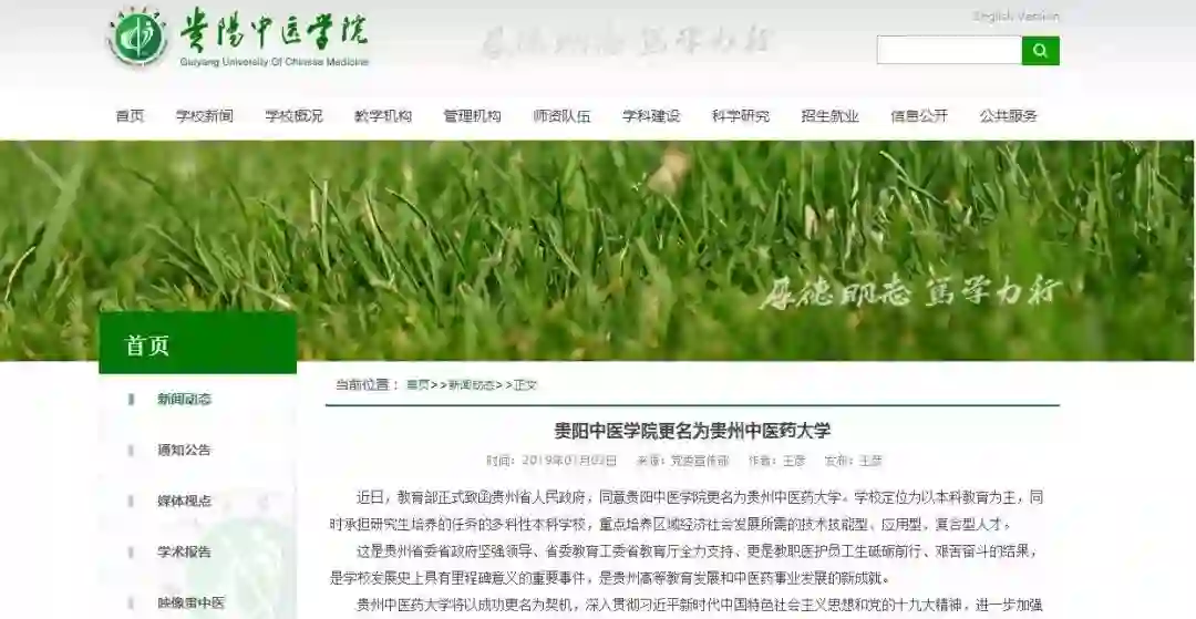 据贵阳中医学院官网消息,近日,教育部正式致函贵州省人民政府,同意贵阳中医学院更名为贵州中医药大学。学校定位为以本科教育为主,同时承担研究生培养的任务的多科性本科学校,重点培养区域经济社会发展所需的技术技能型、应用型、复合型人才。