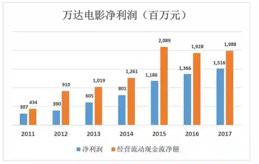 2017年,万达电影净利润15.16亿,为2011年的4.9倍,六年平均复合增长率为30.5%。