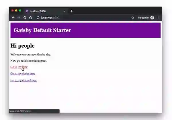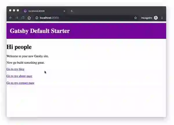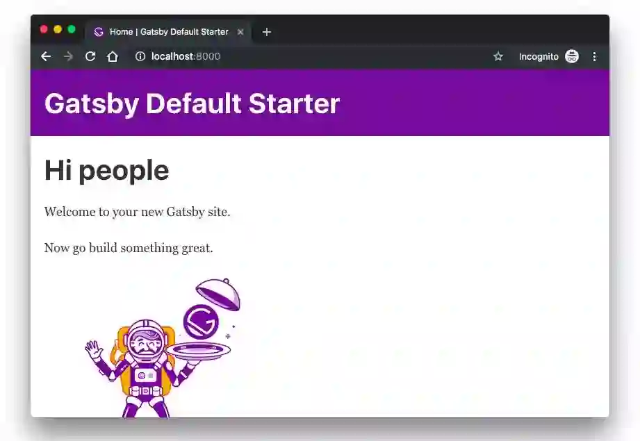 这将在 localhost:8000 上启动项目,在浏览器中打开这个地址就能看到你的 Gatsby 项目了!