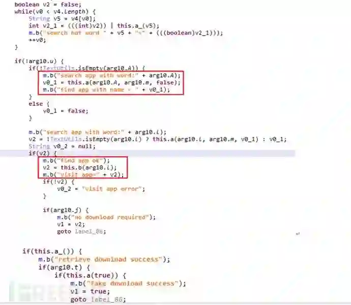 4.1 恶意子包p_ste_1根据云端下发的配置信息针对应用市场进行应用搜索和下载刷量的行为。