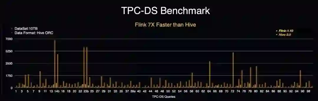 在此基础上将 Flink 作为计算引擎访问 Hive 的 meta 和数据,在 TPC-DS 10T benchmark 下性能达到 Hive 3.0 的 7 倍以上