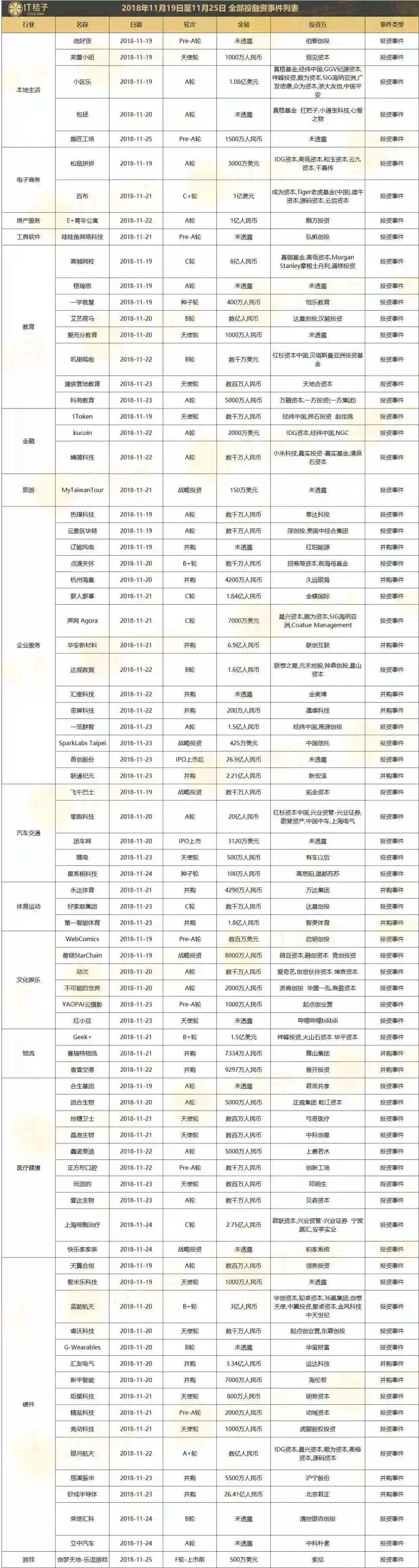 上周全部投融资事件列表:
