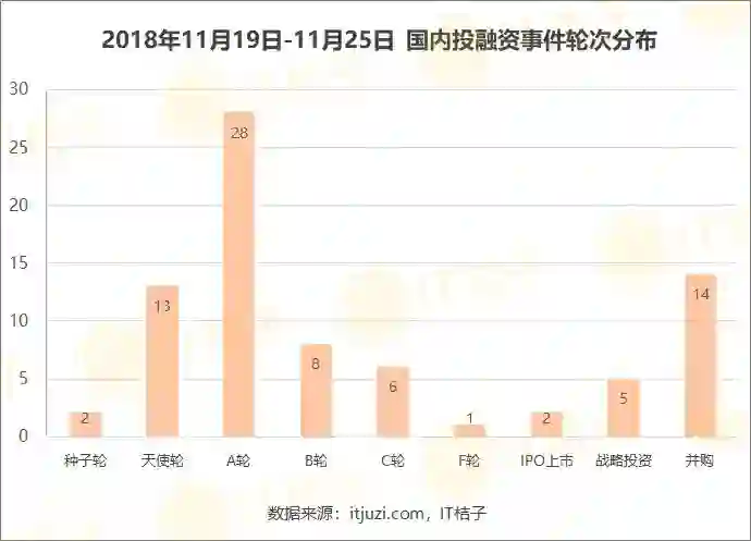 从轮次分布来看,上周早期事件数量占比较大。其中 A 轮投融资事件数量突出,发生 28 起;其次,并购事件位列第二,发生 14 起;天使轮事件发生 13 起。