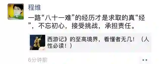 程维今天下午还在朋友圈表示,一路“八十一难”的经历才是求取的真“经 ”,不忘初心,接受挑战,承担责任。