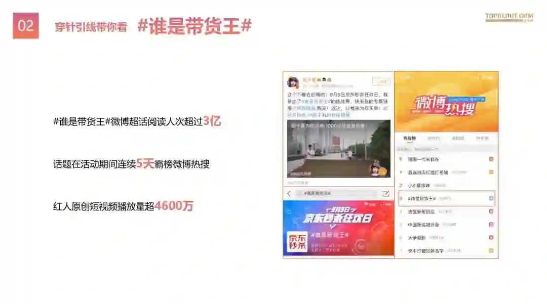 以最近刷屏的京东联合微博联合举办的 #谁是带货王# 活动为例,在资金与流量的双重刺激下,众多红人纷纷制作了各具特色的视频向粉丝“安利好物”。为期5天的 #谁是带货王# 红人电商节活动,有100+知名品牌参与联动,参与红人20万+人次,活动全网曝光超10亿+!