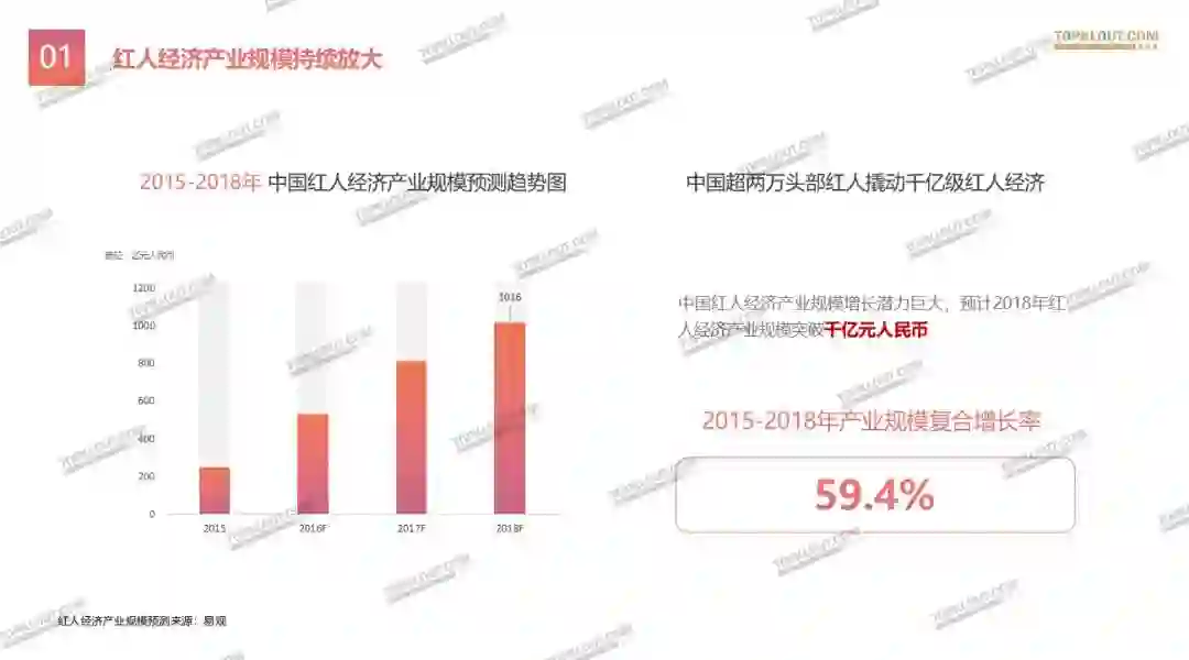 在红人数量与粉丝规模双增长的加持下,红人经济市场规模还将持续增强,预计2018年中国的红人经济产业规模有望突破千亿人民币!
