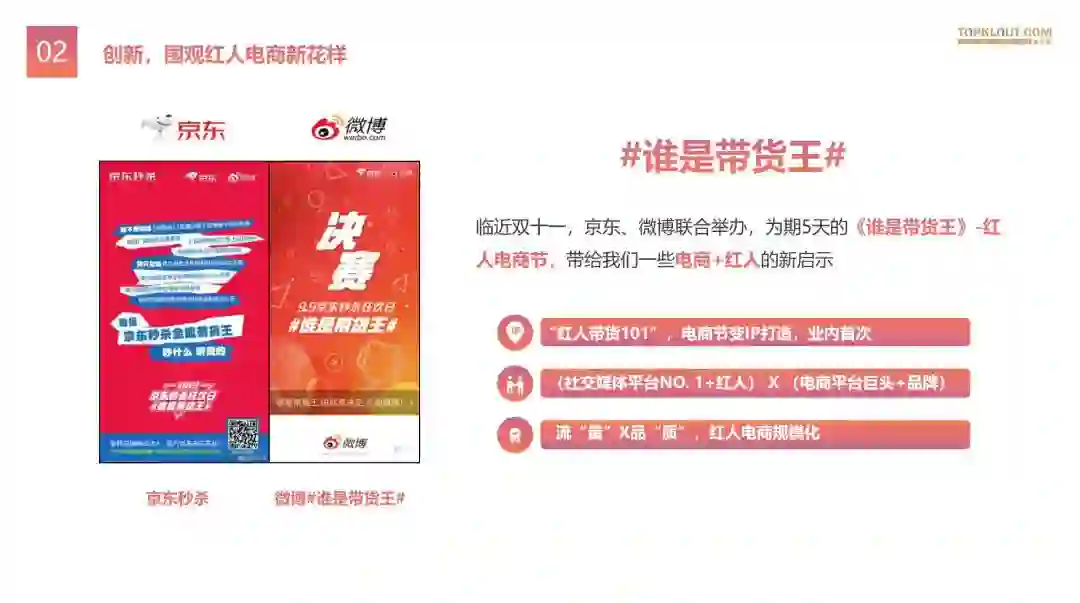 另一反面,“头部电商平台--京东 联合 头部社媒平台--微博” 这种巨头联手模式带来的巨大冲击力,也真正让具有高价值内容生产力的垂直类红人开始从小众市场走向大众舞台,激发了红人生态的活力。