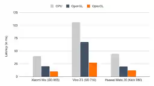 为方便开发者,我们对 TFLite GPU Delegate 添加了一些修改。首先,我们会在运行时检查 OpenCL 的可用性。如果 OpenCL 可用,我们会使用新的 OpenCL 后端,因为其速度远高于 OpenGL 后端;如果 OpenCL 不可用或无法加载,我们将会回退到现有的 OpenGL 后端。事实上,OpenCL 后端自 2019 年年中以来便一直存在于 TensorFlow 代码库中,并已通过 TFLite GPU Delegate v2 版与代码库无缝集成,因此,您可能已在使用代理的回退机制时,用到过这个后端。