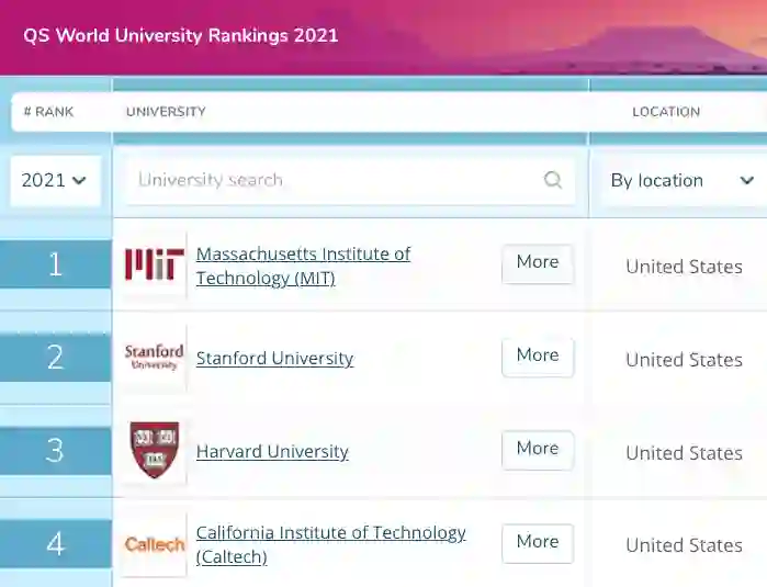 近日,2021 年 QS 世界大学排名全新出炉,在参选的全球 5500 多所高校中,美国的麻省理工学院、斯坦福大学和哈佛大学稳居前三。此外,清华大学由去年的第 16 名上升为第 15 名,再次刷新了中国高校的排名记录。