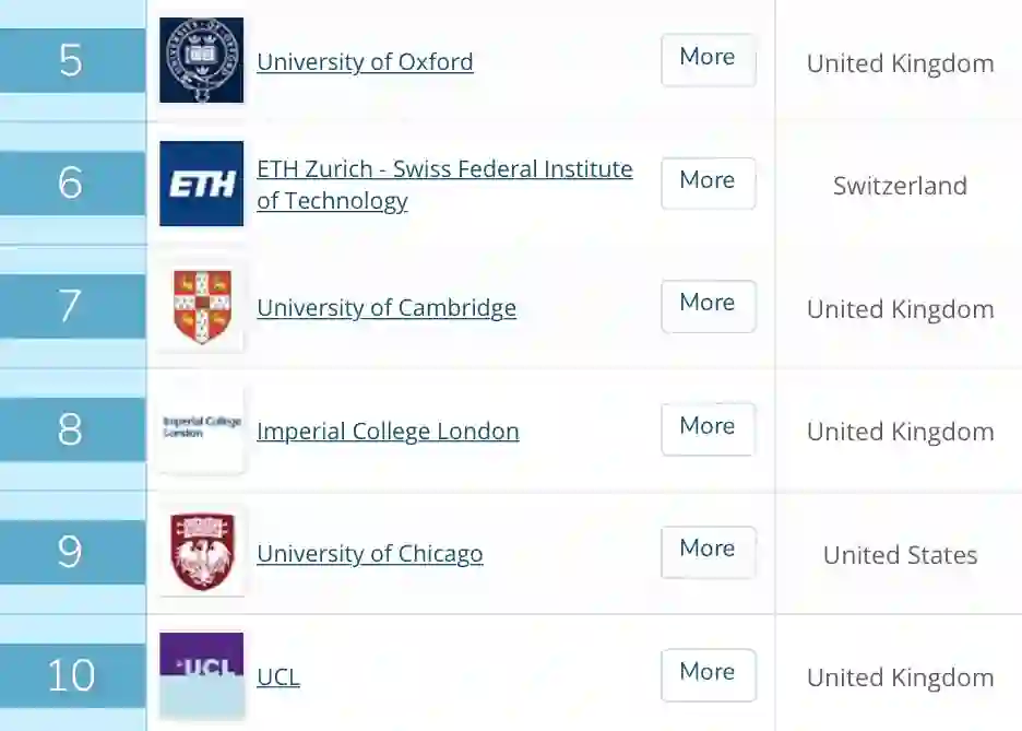 欧洲地区排名第一位的是英国牛津大学,同时进入世界前十名的英国院校还包括剑桥大学(第 7 名)、伦敦帝国理工学院(第 8 名)和伦敦大学学院(第 10 名)。在欧洲地区排名第二位的高校是瑞士的苏黎世联邦理工学院。