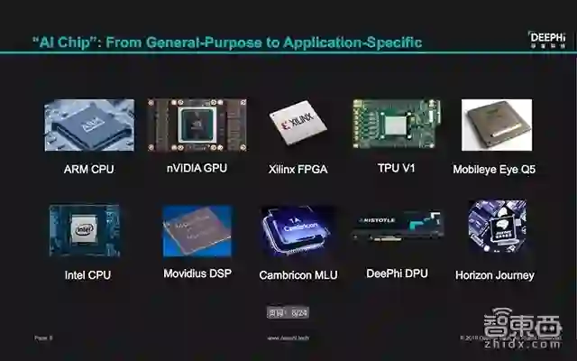 对此,姚颂还举出目前市面上所出现的,针对不同层级AI定义的芯片的例子。比如国外的芯片巨头如ARM将CPU上添加神经网络加速库、NVIDA的针对AI训练侧的GPU、Xilinx的FPGA、针对深度学习推理侧的TPU V1、把自动驾驶算法写到芯片上的Mobileye Eye Q5 、Intel CPU 、Movidius DSP 等都是针对不同层级的AI芯片。国内方面也有不少企业在AI芯片上取得了进展,其针对的AI层级也有所不同,如寒武纪面向更通用的机器学习市场的Cambricon MLU 、 深鉴科技自家的DeePhi DPU则更加关注深度学习层面、地平线的Horizon Journey更专注于面向行业的算法。因此,姚颂总结到:“当你听到一个公司在做AI芯片时,首先需要弄清楚其芯片是针对哪一个AI层级的”。